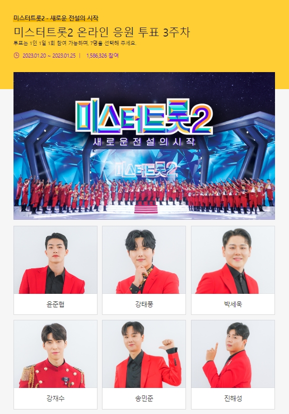 박서진, 진해성, 길병민이 미스터트롯2 TOP3에 올랐습니다. 마지막 최종 우승자는 시청자 문자투표로 가려지게 됩니다. 누구보다 잘하는 참가자를 응원하고 싶다면 그대로 놔두면 안됩니다. 많은 사람들 가운데서 빛을 보는 재야의 고수가 있기를 기대합니다. 현재 순위부터 우승자 예측까지 투표를 하고 싶다면 함께 하길 바랍니다.